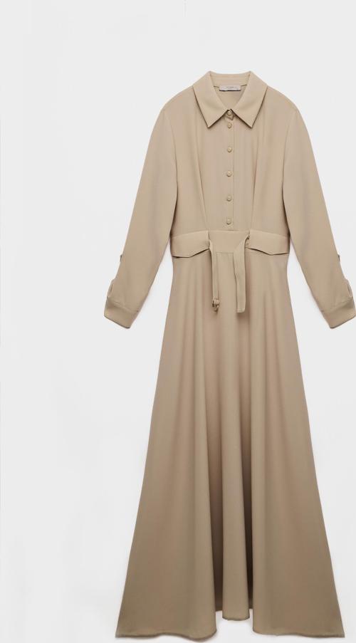 Düğme Detaylı Pileli Uzun Bej Elbise E-0441
