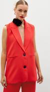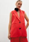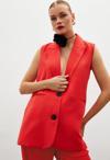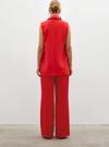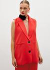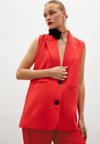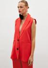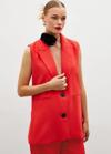 Kruvaze yaka, süs cepli, astarlı, kalça altı boy, kolsuz, düğme detaylı salaş yelek.