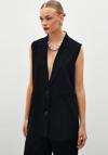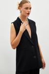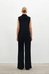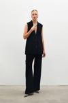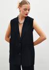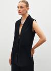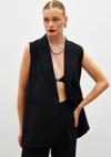 Kruvaze yaka, süs cepli, astarlı, kalça altı boy, kolsuz, düğme detaylı salaş yelek.