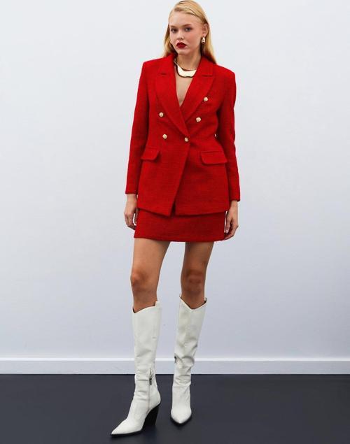 Kruvaze yaka, süs kapaklı cep, astarlı, omuz ince vatkalı, gold düğme detaylı, uzun tüvit ceket.