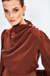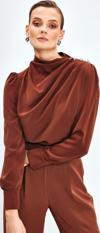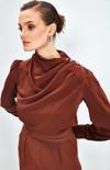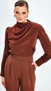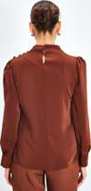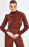 Drapeli yaka, uzun manşetleri düğme iliklemeli kol, süs zirkon taşlı salaş bluz.