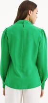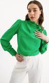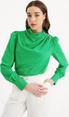 Drapeli yaka, uzun manşetleri düğme iliklemeli kol, süs zirkon taşlı salaş bluz.