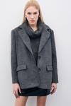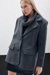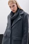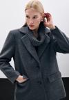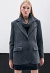 Kruvaze yaka,, düz ve uzun kol, kapaklı süs cep, iç astarlı, ön düğmeli kaşe ceket.