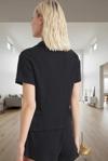 Yaz aylarının sıcak günlerinde bile rahat ve şık kalmak mı istiyorsunuz? Bu siyah düğmeli kaşkorse örme pijama takımı tam size göre! Yumuşak ve nefes alan %55 Polyester, %45 Pamuk karışımı kumaşıyla, gün boyu konfor ve serinlik sağlar. Regular kalıbı, her vücut tipine uyum sağlayarak hareket özgürlüğü sunar. Kısa kollu, gömlek yakalı üst ve boru paça şort altıyla tamamlanan takım, modern ve şık bir görünüme sahiptir. Düğme detayları, takıma zarif bir dokunuş katar.