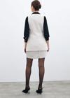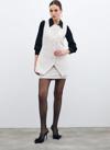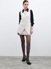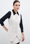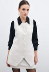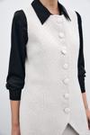 Bisiklet yaka, kolsuz, ön etek ucu asimetrik kesim, iç astarlı, kalça altı boy, düğmeli tüvit yelek.