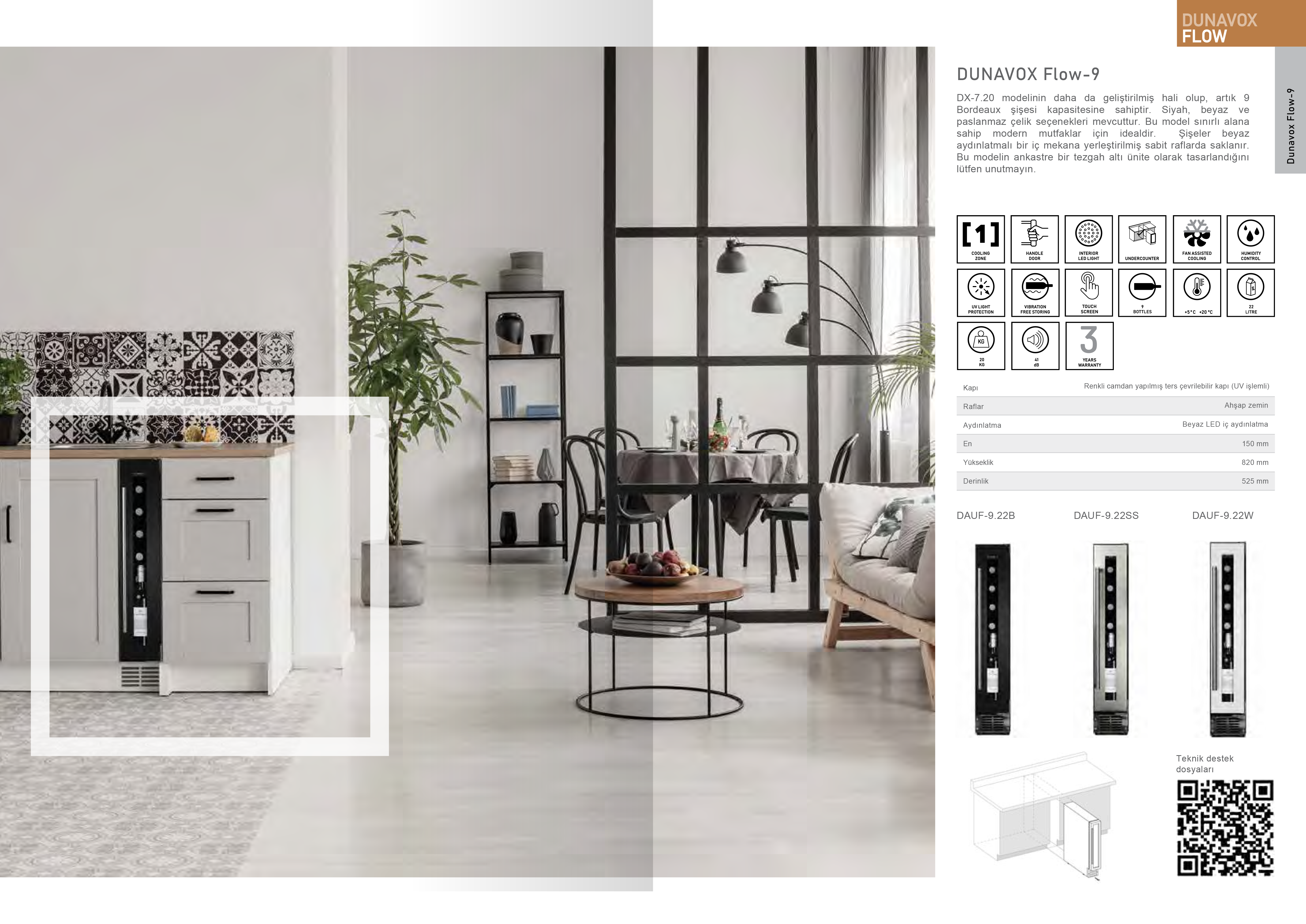 DX-7.20 modelinin daha da geliştirilmiş hali olup, artık 9 Bordeaux şişesi kapasitesine sahiptir. Siyah, beyaz ve paslanmaz çelik seçenekleri mevcuttur. Bu model sınırlı alana sahip modern mutfaklar için idealdir. Şişeler beyaz aydınlatmalı bir iç mekana yerleştirilmiş sabit raflarda saklanır. Bu modelin ankastre bir tezgah altı ünite olarak tasarlandığını lütfen unutmayın.