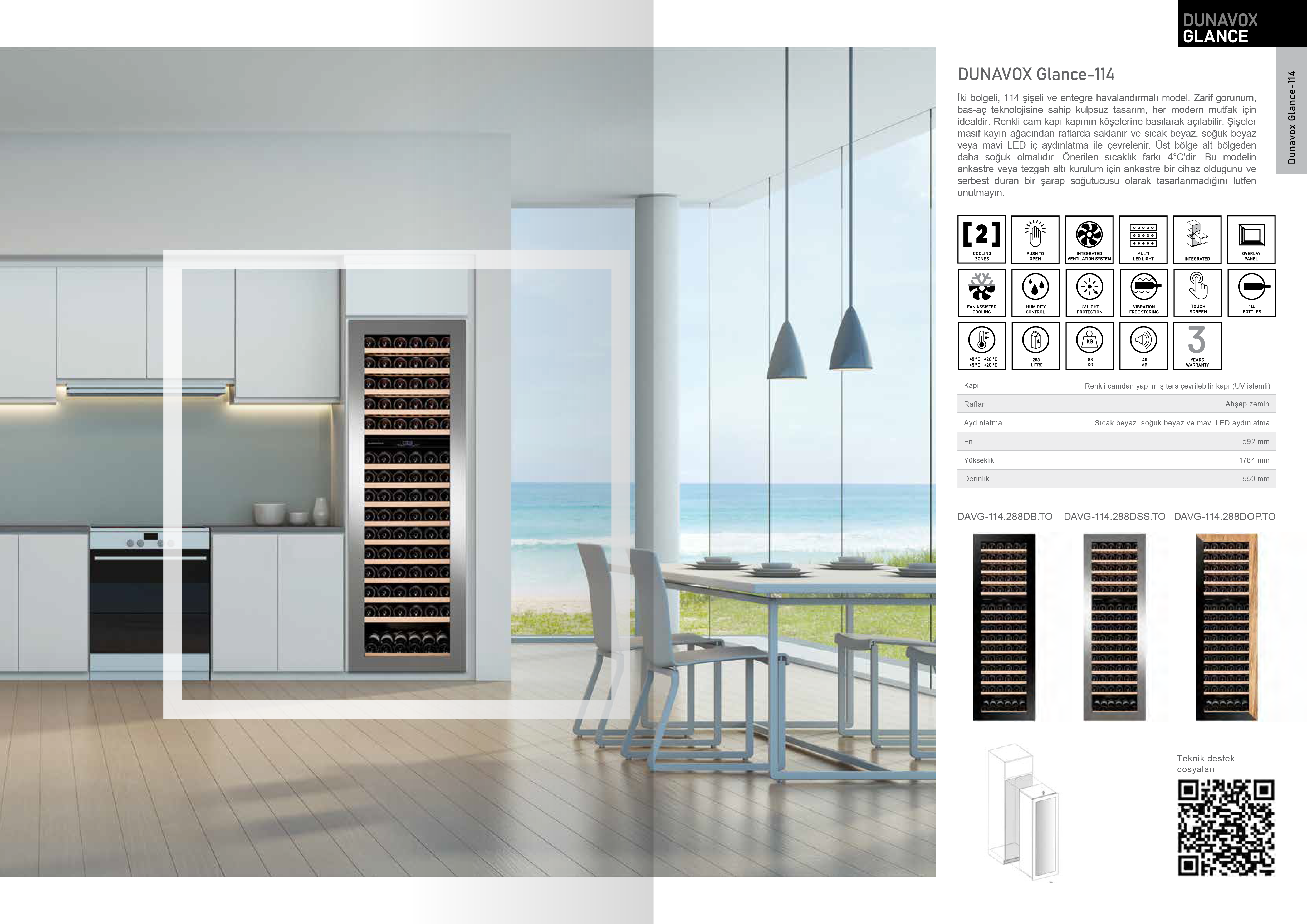 İki bölgeli, 72 şişeli ve entegre havalandırmalı model. Zarif görünüm, bas-aç teknolojisine sahip kulpsuz tasarım, her modern mutfak için idealdir. Renkli cam kapı kapının köşelerine basılarak açılabilir. Şişeler masif kayın ağacından raflarda saklanır ve sıcak beyaz, soğuk beyaz veya mavi LED iç aydınlatma ile çevrelenir. Üst bölge alt bölgeden daha soğuk olmalıdır. Önerilen sıcaklık farkı 4°C'dir. Bu modelin ankastre veya tezgah altı kurulum için ankastre bir cihaz olduğunu ve serbest duran bir şarap soğutucusu olarak tasarlanmadığını lütfen unutmayın.