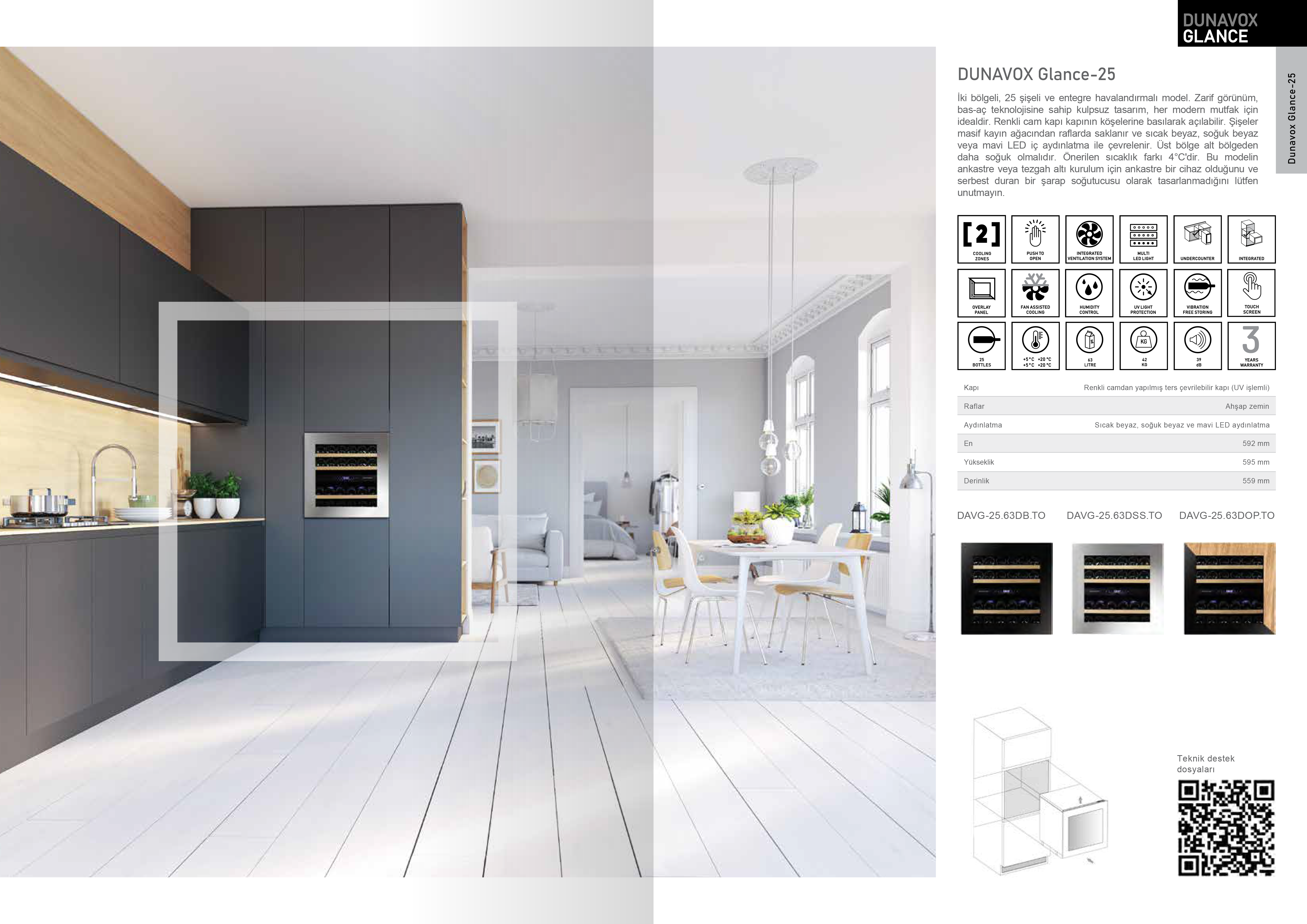 İki bölgeli, 25 şişeli ve entegre havalandırmalı model. Zarif görünüm, bas-aç teknolojisine sahip kulpsuz tasarım, her modern mutfak için idealdir. Renkli cam kapı kapının köşelerine basılarak açılabilir. Şişeler masif kayın ağacından raflarda saklanır ve sıcak beyaz, soğuk beyaz veya mavi LED iç aydınlatma ile çevrelenir. Üst bölge alt bölgeden daha soğuk olmalıdır. Önerilen sıcaklık farkı 4°C'dir. Bu modelin ankastre veya tezgah altı kurulum için ankastre bir cihaz olduğunu ve serbest duran bir şarap soğutucusu olarak tasarlanmadığını lütfen unutmayın.