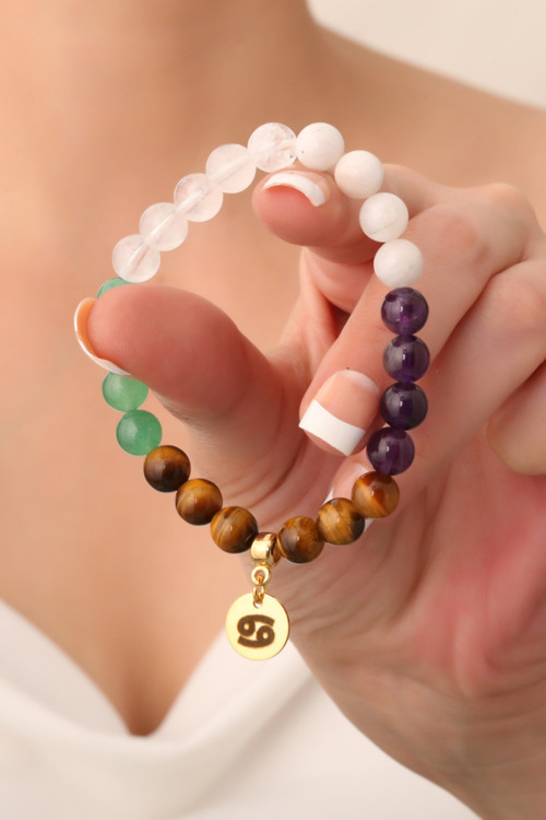 Yengeç burcu doğaltaş bilekliği Ay Taşı, Ametist, Aventurin, Kristal Kuvars ve Kaplan Gözü taşlarından oluşmaktadır.