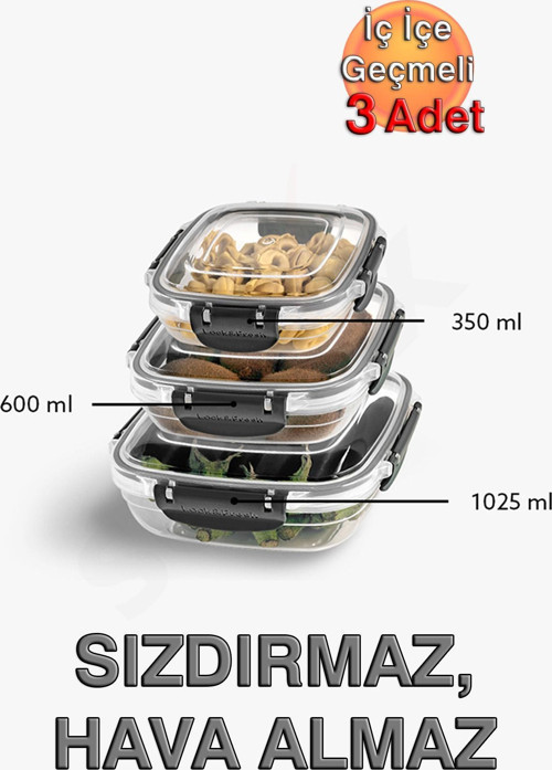 - Üç farklı boyutta (350, 600 ve 1025 ml) sunulan bu saklama kabı seti, çeşitli gıda ihtiyaçlarınıza kolayca uyum sağlar.