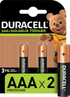 Duracell Şarj Edilebilir AAA 750mAh piller, 100 kez yeniden şarj edilebilir. Mouse veya bebek telsizi gibi düzenli kullanılan cihazlar için uygundur.Cihazlarınıza hemen güç sağlayabilmeniz için önceden şarj edilmiştir ve kullanılmadığında 12 aya kadar dolu şarjlı kalırlar.Ek olarak, Duracell Şarj Edilebilir AAA 750mAh pillerin 3 yıl dayanma garantisi mevcuttur. Bu güçlü NiMH piller, tüm NiMH şarj cihazlarıyla çalışır ve AA 1300mAh ve AAA 750mAh boyutlarında sunulmaktadır.