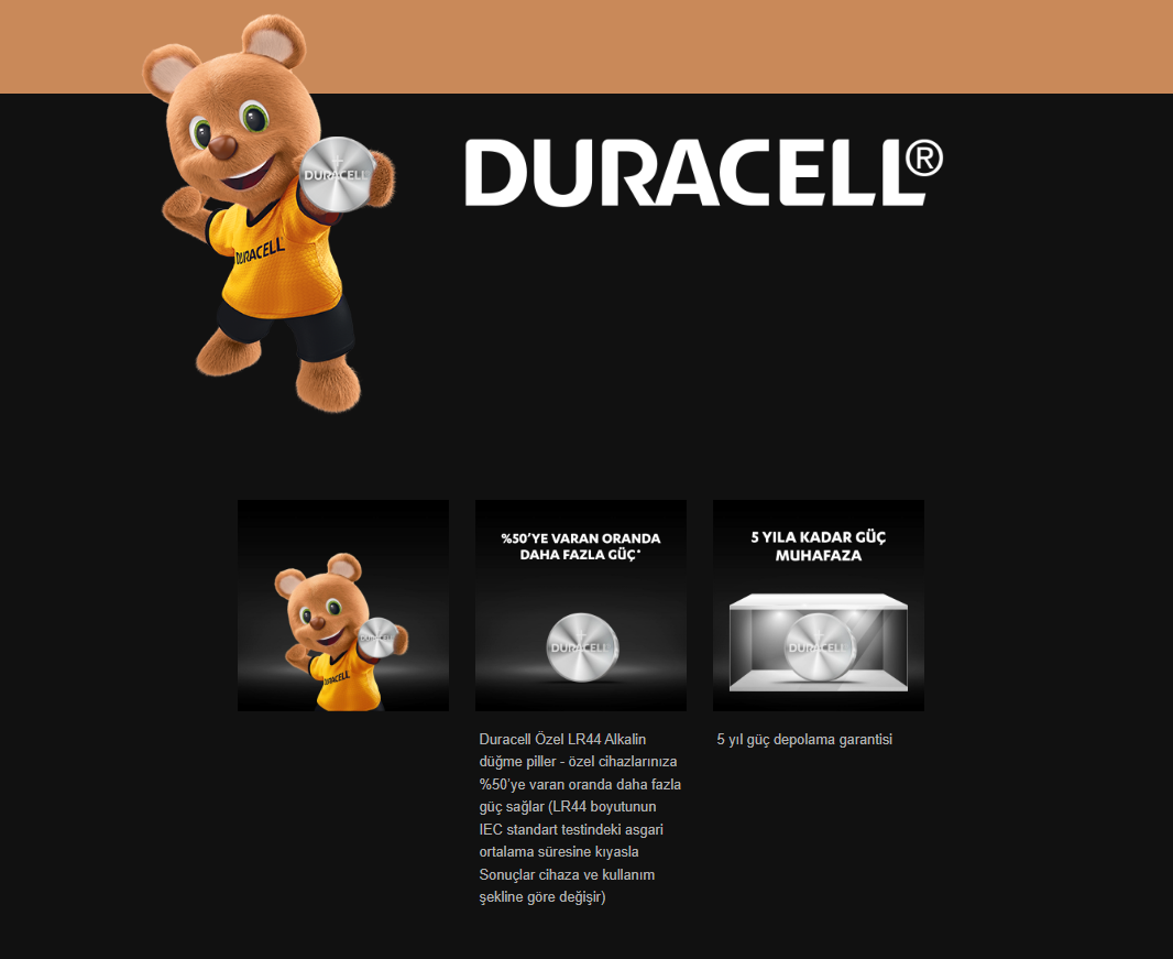 Duracell Özel LR44 Alkalin düğme piller - özel cihazlarınıza %50’ye varan oranda daha fazla güç sağlar (LR44 boyutunun IEC standart testindeki asgari ortalama süresine kıyasla Sonuçlar cihaza ve kullanım şekline göre değişir). Duracell Özel LR44 alkalin piller, tıbbi cihazlarınız (termometre, glukometre, tansiyon aletleri), güvenlik cihazları (banka kartı okuyucu, alarm vericisi), oyuncaklar (küçük oyuncaklar, çocuk kitapları) ve diğer elektronik aletler (saat, hesap makinesi, lazer kalem, havlama önleyici spreyli tasma) için güvenilir bir seçimdir. Duralock teknolojisi, depolama sırasında pilleri 5 yıla kadar dolu tutar.