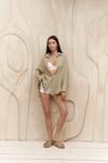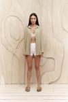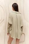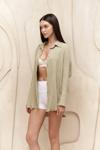 Oversize kalıp, yakalı ve manşetli, uzun kollu, önü düğmeli, etek ucu yuvarlak, arkası biraz daha uzun.