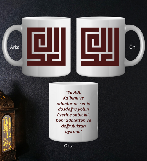 El Adl Tasarımlı Dua Yazılı Porselen Kupa Bardak - Kufi Tarzı İslami Hediye