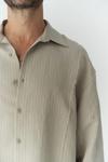 Modal karışımlı kumaştan, oversize gömlek. İtalyan yaka ve düğmeli manşetli, uzun kollu. Önü düğmeli. Pis şerit detay ve çizgili tasarım.