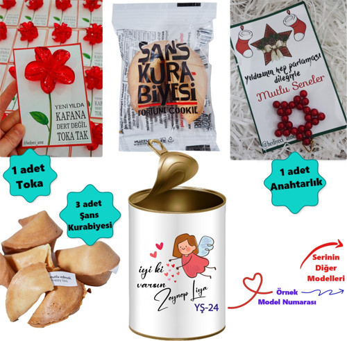 Kişiye Özel Konsept Hediye Kutusu - 3 Adet Şans Kurabiyesi, 1 adet Yıldız Anahtarlık ve Çiçek Toka Hediye SetiKonsept konserve kutusunun dış etiketi kişiye özel olarak hazırlanmaktadır.Metal teneke konserve kutusu içerisinde:3 Adet Şans Kurabiyesi, 1 adet Yıldız Anahtarlık, 1 adet Çiçek Toka bulunmaktadır.Konserve Konseptli Hediye Kutusu Hakkında Bilinmesi GerekenlerKonservenin dış tasarımı kişiye özel hazırlanmaktadır. Ürün, teneke gıda konservesi şeklinde tasarlanmış ve içerisinde şans kurabiyesi bulunan sürpriz hediye kutusudur.Konserve tenekesinin kapağı kapalı şekilde gönderilmektedir. Dikkatli bir şekilde açma halkasından açmalısınız.Konserve kutusu konsepti hem içerisindeki hediyenin sürpriz olması, hem korunaklı gönderimi hem de ürün açıldıktan sonra kutunun kalemlik, saksı, masa üstü düzenleyici vb şekilde kullanılması açısından oldukça dikkat çekmekte ve merak uyandırmaktadır.Konserve tenekelerinin içerisini lezzetli mi lezzetli yeni üretim şans kurabiyesi bulunmaktadır.İlginç konsept metal hediye kutusu ile sevdiklerinizi mutlu edebilirsiniz.