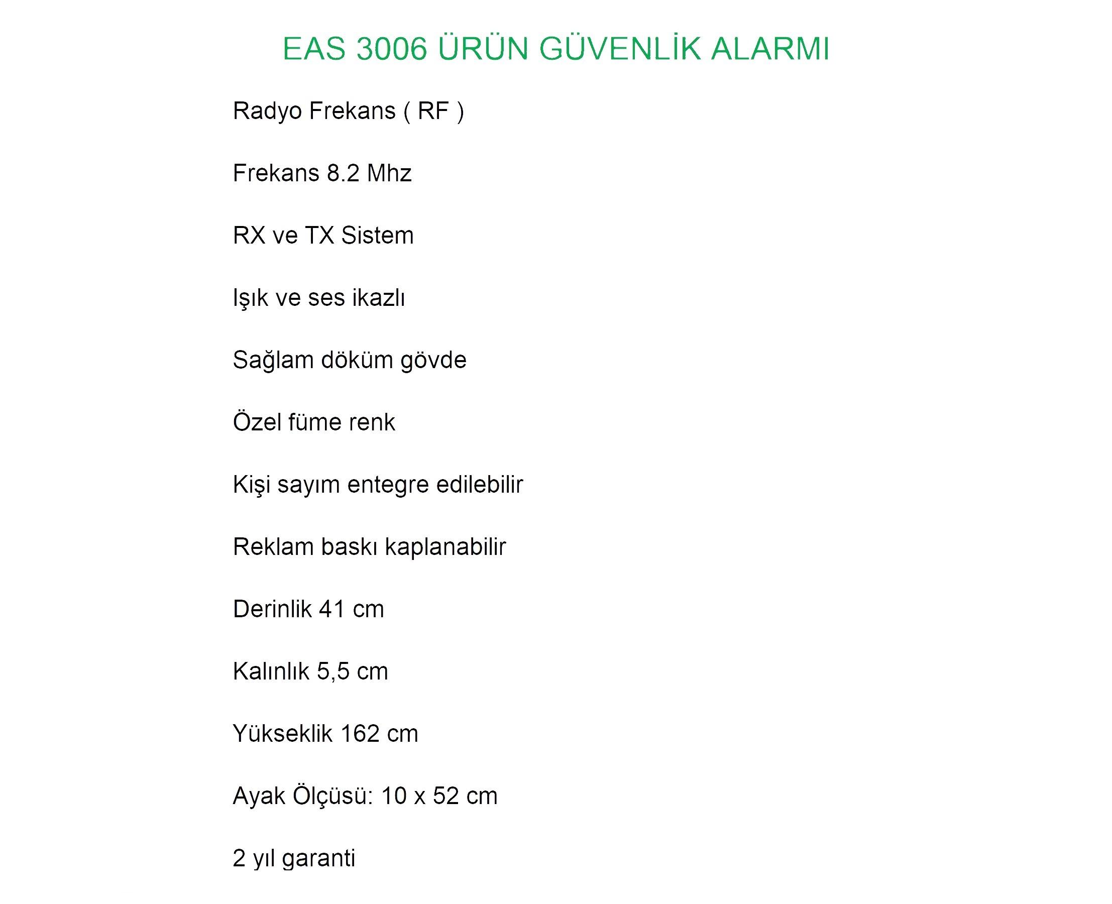 Secadoor EAS 3006 mağaza hırsız ürün güvenlik sistemi, özellikle süpermarketler için tasarlanmıştır. Döküm gövdeden üretilmiştir. Secadoor EAS 3006 ürün güvenlik sistemi, sağlam ve dayanıklı gövdeden üretilmiş bir ürün güvenlik anteni... RX ve TX olarak takım olarak sunulmaktadır. Oluşturulan koridorlardan geçen 8,2 Mhz alarm etiketlerini algılayarak alarm vermektedir. Antenler arası koridorların genişliği ve alarm etiketlerini yakalama performansı, kullanılan alarm etiketlerinin büyüklüğü ya da küçüklüğü ile doğru orantılıdır. Alarm etiketleri ne kadar büyük ise yakalama performansı daha etkili olacaktır ve de antenler arası koridorların daha geniş tutulmasına imkân sağlayacaktır. Özellikle market, süpermarket, hipermarket ve yapı market vb. alışverişin yoğun olduğu, market arabalarının sıklıkla kullanıldığı alanlarda, EAS 3006 darbelere karşı oldukça dayanıklıdır. Bu konuda da iddialı yapısı ile adından sıkça bahsettirmektedir. Sizlerin de mağazanızda bulunan ürün güvenlik antenlerinin kırılması, yıkılması vb. gibi sorunlar ile karşılaşmak istemiyorsanız, EAS 3006 ürün güvenlik antenlerini kurun, rahat edin... Gözünüz arkada kalmasın...