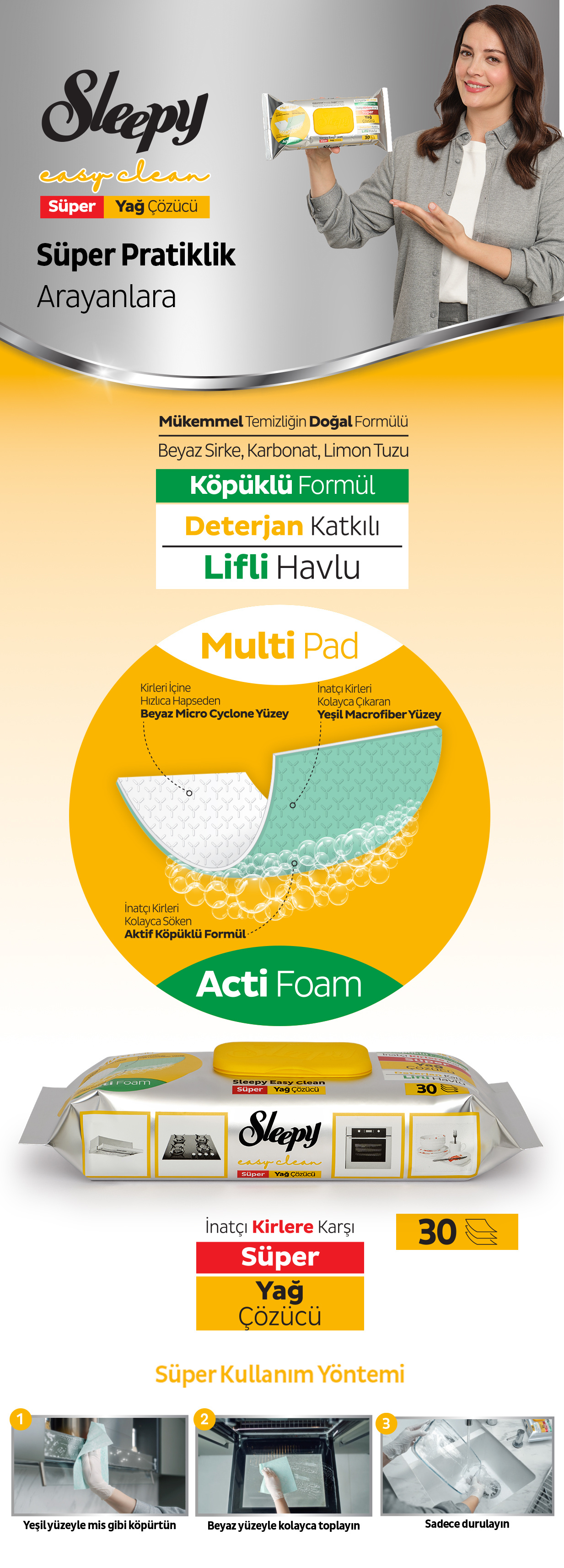 Sleepy Easy Clean yüzey temizleme havlusu, mutfakta süper pratiklik arayanlara Sleepy Easy Clean Süper Yağ Çözücü’yü geliştirdi. İnatçı kirlere karşı içeriğindeki beyaz sirke, karbonat, limon tuzu ile mükemmel temizliğin doğal formülünü sunuyor. Deterjan katkılı lifli havlu Süper yağ çözücü, Beyaz Micro Cyclone ve Yeşil Macro Fiber’den oluşan çift taraflı yüzey yapısına sahip. Yeşil Macro Fiber yüzey aktif köpüklü formülü ile zor kirleri kolayca sökerken, Beyaz Micro Cyclone yüzey kirleri içine hapsediyor. Yeşil yüzeyi ile köpürtme, beyaz yüzeyi ile toplama ve ardından durulama ile temizlik yalnızca 3 adımda sona eriyor.