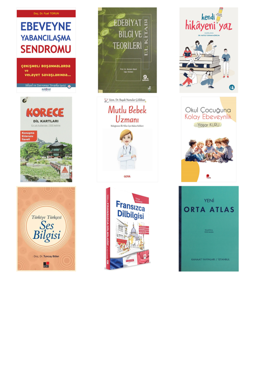 Ebeveyne Yabancılaşma Sendromu - Edebiyat Bilgi ve Teorileri El Kitabı - Kendi Hikâyeni Yaz - Korece Dil Kartları - Mutlu Bebek Uzmanı - İmzalı - Okul Çocuğuna Kolay Ebeveynlik - Türkiye Türkçesi Ses Bilgisi - Türkçe Açıklamalı Fransızca DilBilgisi - Yeni Orta Atlas