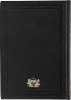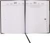 Ece klasiği, siyah özel cilt bezi üstüne gofre ve yaldız baskılı kapak. Ciltli, kurdele ayraçlı, her sayfada bir günlük ticari, çizgili ajanda.