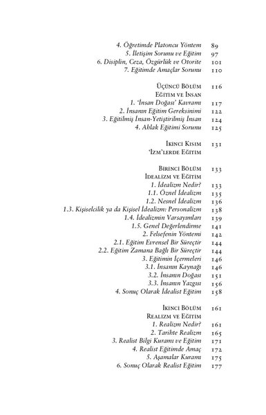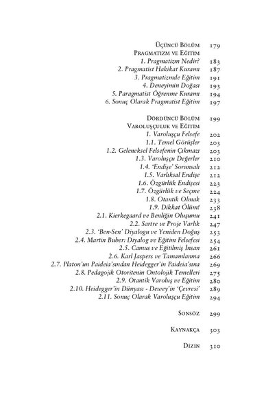Bir ‘metafelsefe’ ile felsefe akımları, idealizm, realizm, naturalizm, pragmatizm, varoluşçuluk ve analitik felsefenin mahiyetleri ile birlikte eğitim anlayışlarını eleştirel bir okuma ile okura sunmaktadır.