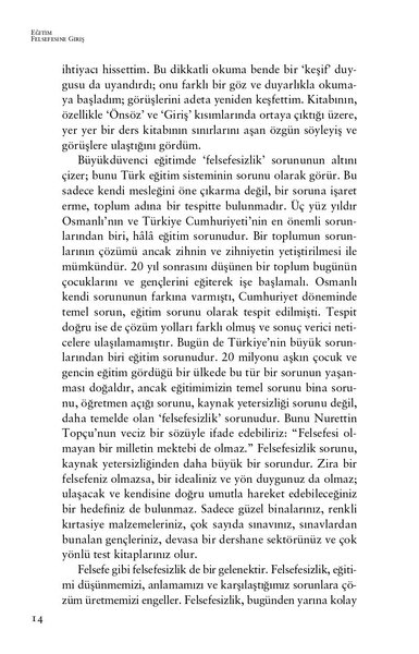 Elinizdeki kitap, herhangi bir eğitim felsefesi kitabı değildir; sınavlarda ezberlenmek üzere, akımlar ve filozoflar arasında madde madde sıralanmış karakteristikler bu eserde yer almaz.