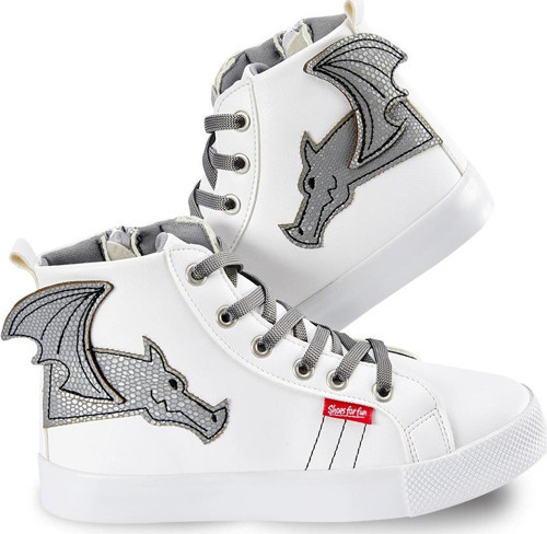 Beyaz, yüksek konçlu erkek çocuk sneakers ayakkabı. Ayakkabının dış yanlarında ejderha aplikesi vardır. Kanatları 3 boyutludur. Suni deriden yapılmıştır. Nemli bez ile temizlenebilir.