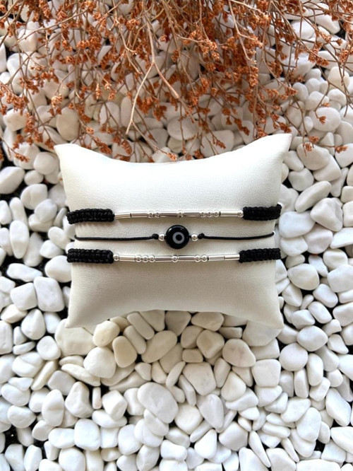Eka Tasarım Mors Alfabesi 2'Li Bileklik 925 Ayar Gümüş Ve Nazar Boncuğu Bileklik + (1 Adet Hediye Bileklik)