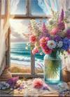 Vazodaki Çiçekler Ve Deniz Manzarası Desenli Ahşap Tablo 25 cm x 35 cm