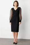 Detay: Zarif V yaka tasarımıyla feminen bir siluet sunan bu uzun kollu elbise, balon kol detaylarıyla romantik ve hacimli bir görünüm kazandırır. Astarlı polyester kumaşı sayesinde hem konforlu hem de şık bir duruş sergiler. Fermuarlı kapama özelliğiyle pratik kullanım sağlayan bu elbise, özel davetlerden günlük şıklığa kadar geniş bir kullanım alanı sunar;
