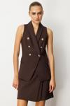 Detay: Bu yelek modeli, dokuma kumaş tipiyle hem dayanıklılık hem de şıklık sunarken, astarlı yapısı sayesinde konforlu ve düzgün bir kullanım sağlar. Kruvaze yaka detayı sofistike ve zarif bir görünüm kazandırırken, kolsuz tasarımı katmanlı giyime uygun bir stil sunar. Düğmeli kapama şekli klasik bir dokunuş sağlarken, kapaklı cepler hem işlevsel hem de tasarımı tamamlayan detaylardır. Hem resmi hem de günlük kombinlerde rahatlıkla kullanılabilecek, stil sahibi bir tamamlayıcı parçadır;