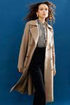 Detay: Önü düğmeli, kuşaklı, astarlı, uzun, cepli trençkot;