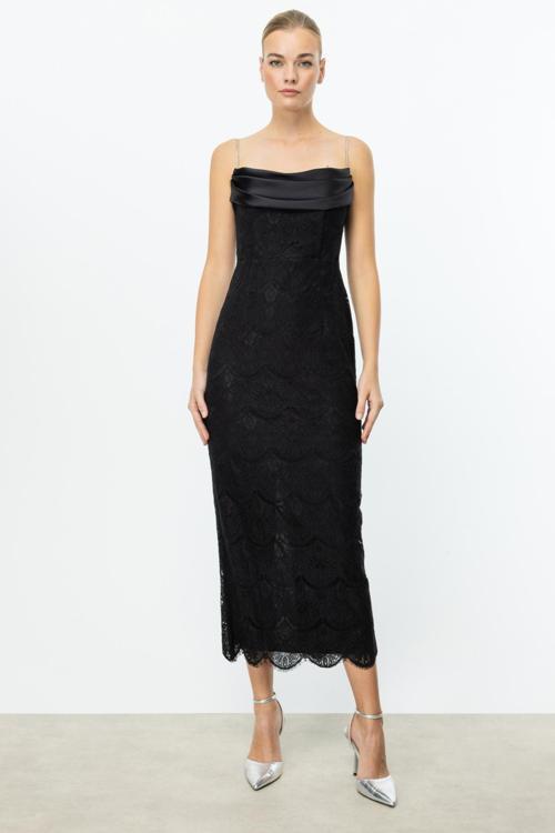 Detay: Straplez tasarımıyla zarif ve feminen bir şıklık sunan bu ince elbise, dantel kumaşıyla göz alıcı bir detay kazanıyor. Askılı yapısı, elbiseye zarif bir dokunuş katarken, astarlı tasarımı hem konfor hem de kusursuz bir görünüm sağlıyor. Arkadan fermuarlı ve arka kısmı yırtmaçlı detayları, hem pratik hem de sofistike bir stil sunarak, özel davetlerde unutulmaz bir izlenim bırakmanızı sağlayacak tam kalıp bir tasarım oluşturuyor.;