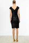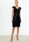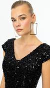 Ürün Özellikleri:Pullu payetli, ön ve arka kısmı v yaka, fermuar kapamalı, kolsuz, astarlı, midi boy
