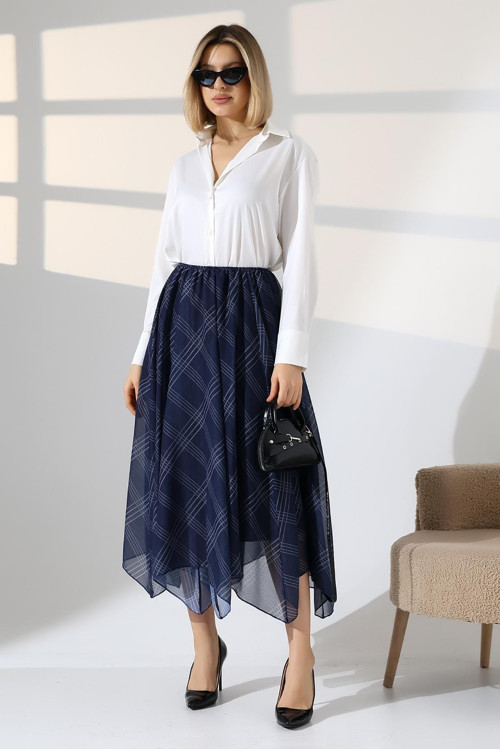 Lubiti Ekose Desenli Asimetrik Şifon Etek–Hafif Kumaş ve Trend Tasarım