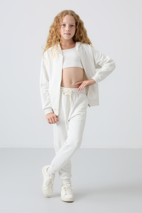 Tommy Life Ekru Pamuklu İçi Tüylü Yumuşak Dokulu Standart Fit Nakışlı Kız Çocuk Eşofman Takım - 75148