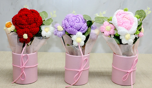 Örgü gül ve küçük çiçek detayları ürüne sıcak, yumuşak ve doğal bir görünüm kazandırırken, pembe tonlardaki dekoratif saksı ve kurdele detayı ürünü hediye edilmeye hazır sevimli bir aranjmana dönüştürür. El işçiliğiyle üretildiği için her bir buket kendine özgüdür ve el yapımı dokusu sayesinde bulunduğu ortama estetik bir hava katar.