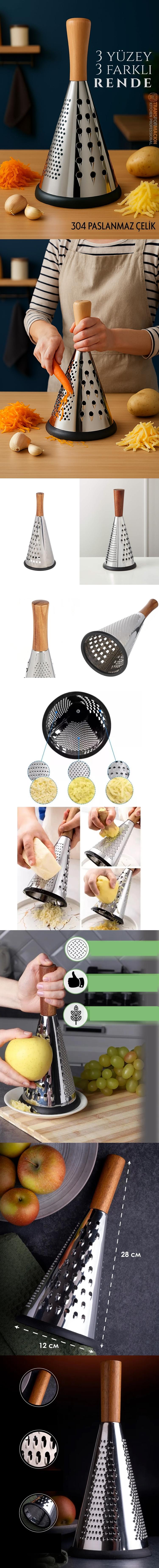 🧀 Konik Tip Çok Fonksiyonlu Rende – 304 Paslanmaz Çelik | Ahşap Saplı | 3 Farklı Yüzey | Transformacion Kitchen Professional