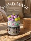 El yapımı dantellerle süslenmiş ve boncuk detaylarıyla zenginleştirilmiş bu porselen saksılık, masaüstünüzü şık bir şekilde tamamlar.