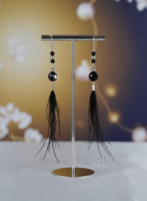 El yapımı siyah tüy küpe, zarif ve dikkat çekici tasarımıyla stilinizi ön plana çıkarır.