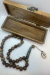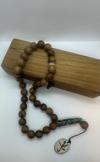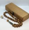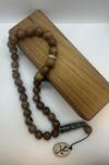 - 33 adet burma teak ağacı boncuk, 2 adet el yapımı seramik boncuk, seramik imame ve uç kısmında “Muhammed” yazılı seramik detay ile tamamlanmıştır.
