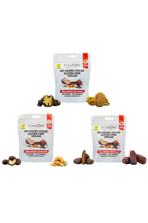 Elamore Şeker İlavesiz, Glütensiz, Vegan Ceviz, Kaju, Hurma Bitter Çikolata - Doypack 50 Gr X 3 Adet