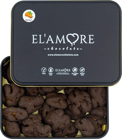 Şeker İlavesiz, Glütensiz, Vegan Cevizli Bitter Çikolata - Küçük Kare Metal Kutu, 150 gr