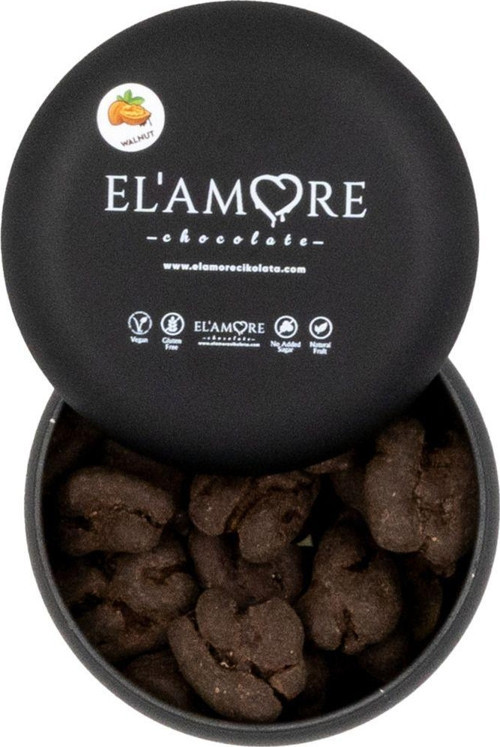 Elamore Şeker İlavesiz, Glütensiz, Vegan Cevizli Bitter Çikolata - Siyah Yuvarlak Metal Kutu, 150 Gr