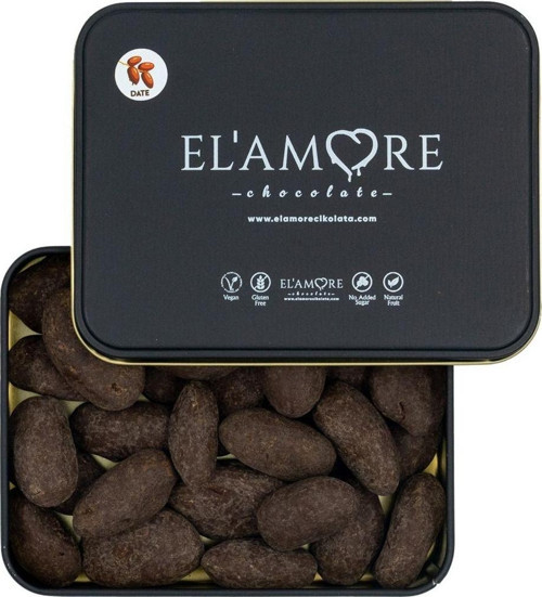 Şeker İlavesiz, Glütensiz, Vegan Hurmalı Bitter Çikolata - Küçük Kare Metal Kutu, 150 gr