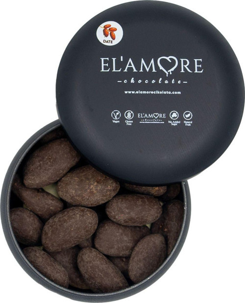 Elamore Şeker İlavesiz, Glütensiz, Vegan Hurmalı Bitter Çikolata - Siyah Yuvarlak Metal Kutu, 150 Gr