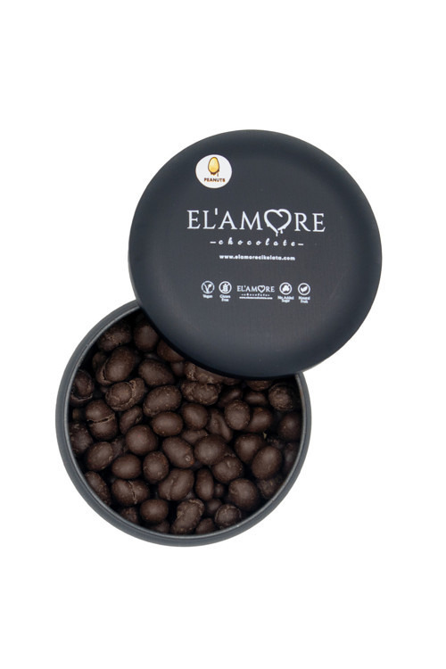 Elamore Şeker İlavesiz, Glütensiz, Vegan Yer Fıstıklı Bitter Çikolata - Siyah Yuvarlak Metal Kutu, 150 Gr