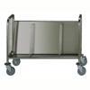 304 AISI paslanmaz çelikten üretilmiştir. 25x25 mm kare borudan yapılmış, tamamen kaynaklı çerçeve. Kenarları yukarı kıvrık, dikişsiz taban ve arka raflar. Raflar çerçeveye kaynaklıdır. Taban rafı eğimlidir. Krom kaplamalı galvanizli çelik telden yapılmış tepsi bölücü, farklı konumlara yerleştirilebilir. Kulplar, yük taşıyan çerçevenin bir uzantısıdır. 4 adet, ikisi frenli, 125 mm çapında döner tekerlek.Plastik tamponlarla donatılmıştır. Kapasite: n. 300x1/1EN istiflenmiş tepsiler.