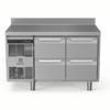 Dış ve iç kısım AISI 304 paslanmaz çeliktir. Tezgah kalınlığı 50 mm, entegre arka sıçrama paneli h=100 mm ile donatılmıştır. Yalıtım kalınlığı 90 mm. N. 4X1/2 çekmece. Dahili soğutma ünitesi. Havalandırmalı çalışma modu. Buharlaştırıcı. Harici dijital sıcaklık göstergeli elektronik mikroişlemci kontrolü. Otomatik buz çözme. Çalışma sıcaklığı: -2+10°C. CFC ve HCFC içermez. Soğutma devresinde R290 gazı. Köpükteki gaz: Siklopentan.