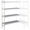 Köşe montajı için. 4 katlı raf seti, panjurlu polietilen bölmeli raflar (derinlik=373 mm). Alüminyum (20 mikron) yan dikmeler (yükseklik=1700 mm). Ayarlanabilir ayaklar. Lineer raf ünitesiyle birlikte kullanılabilir